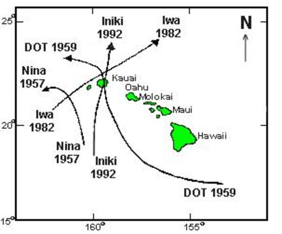This hurricane brought heavy rains and floods to Kauai. In just 14 hours 20.42 inches of rain were recorded in Wainiha. Strong winds were also recorded at 92 mph on Kauai. On the south coast of Kauai 35 foot waves were recorded causing $100,00 of damage. More Information: NOAA Picture Caption: Track of Hurricane Nina.