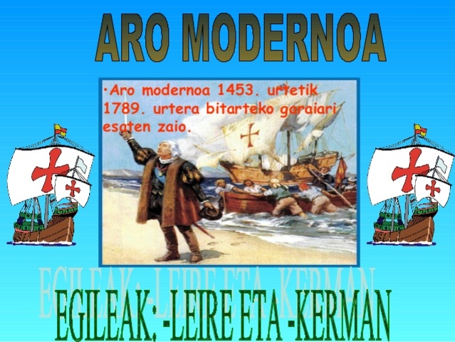Aro modernoa By Enekoruiz 1978 BCE Joana I.a 1978 BCE Filipe I.a 1800 BCE Iparrorratza 1713 BCE Mapa portulanoa 1700 BCE Astrolabioa 1700 BCE Ilustrazioa 1600 BCE Barrokoa 1558 BCE Karlos I.a Espainakoa 1516 BCE Fernando II.a Aragoikoa 1512 BCE Gaztelak Nafarroa bereganatu zuen 1500 BCE Errenazimentua 1492 BCE Juduen kanporaketa 1492 BCE Amerikaren aurkikuntza 1482 BCE Maria Burgundiakoa