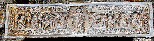 No centro do dintel atopamos ó Salvador, encerrado nunha mandorla que portan dous anxos. A cada lado de Cristo sitúanse tres apóstolos baixos arcos de ferradura, adoptando cada unha das figuras a forma arquitectónica. O relevo está realizado de xeito extraordinariamente plano, tomando coma modelo as pinturas ó fresco, os relieves en marfil, a iluminación de libros ou a orfebrería. Imita o dintel de Sureda, pero ten un ton máis arcaizante.