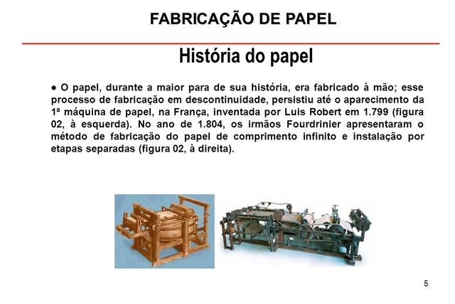 O francês Nicholas-Louis Robert inventou a primeira máquina de fazer papel. No entanto, o resultado não era tão bom quando o feito à mão. Por volta de 1800, os irmãos ingleses Fourdrinier apresentaram um método novo de produção e melhoraram o equipamento. Na segunda metade do século 19, a madeira substituiu os trapos de tecidos e o processo de fabricação passou a ser constantemente aperfeiçoado.