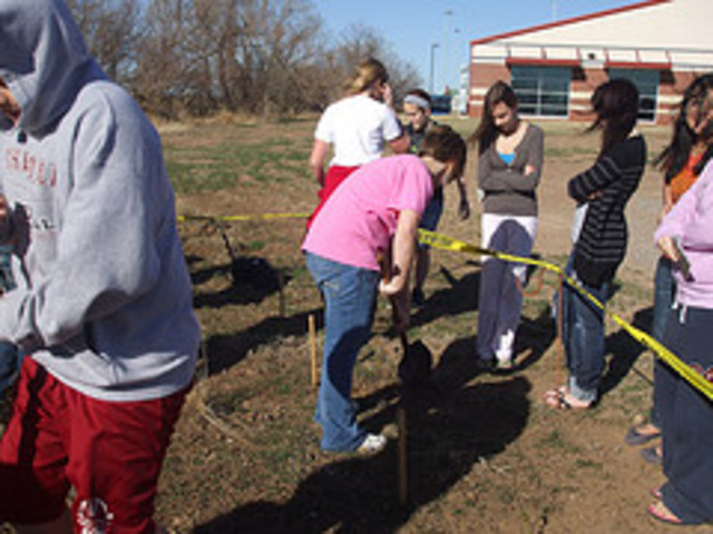 The materials that we used were wooden stickes, sleg hammer, rebar sticks, caution tape, shovles, apple, orange, paper, cotton, aluminum foil, regular chips bag, sun chips bag, and syrofoam.