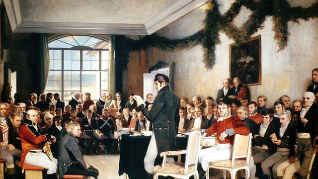 Grunnloven ble vedtatt 17.Mai 1814 på Eidsvoll. Menn som hadde bodd i Norge over 5 år som eide jord og var over 25 år hadde stemmerett.