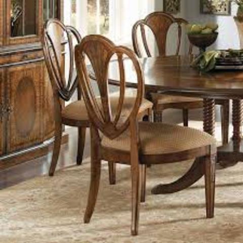 In contrast to the popular cabriole legs of earlier styles, such as Queen Anne, Hepplewhite pieces usually have straight legs.Hepplewhite-style feet are usually simple: a rectangular spade foot or a tapered arrow foot.Common motifs include swags, ribbons, feathers, urns and trees.Pieces have simple geometric shapes, usually curved or circular. Sofa and chair arms curve outward, seats have rounded fronts and chair backs are shaped like ovals or shields.