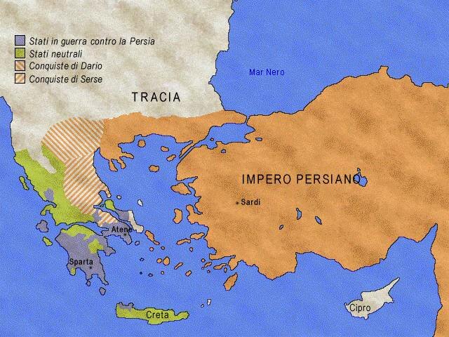 Nel 485a.C. muore il re Dario e gli successe il figlio Serse, il quale non rinunciò ai progetti paterni. Nel 481a.C. i persiani si misero nuovamente in marcia verso la Grecia con l'obbiettivo di stringere d'assedio la città greche ribelli. Nel 481 a.C. i Greci formarono la Lega panellenica. -