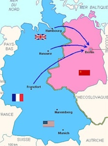 En 1945 les Alliés vainqueurs (Etats-Unis, URSS, Angleterre et France) divisent l'Allemagne et Berlin en quatre zones d'occupation.