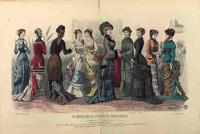 Se aprecia claramente un cambio en la linea del vestido femenino, transición de los aros a una especie de polizón, el cuerpo adquiere la forma de una paloma buchona, bastante escotado.