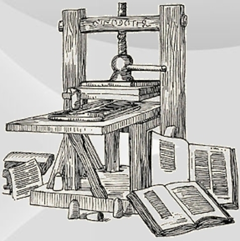 L'allemand Gutemberg est supposé avoir inventé l'imprimerie en 1454, et a imprimé sa première bible en 1456 (à 180 exemplaires !). Toutefois ce sont encore les chinois qui ont inventé l'imprimerie : Bi Sheng utilise pour la première fois des caractères mobiles (en argile). Toutefois Gutemberg est le premier à avoir utilisé des caractères en métal, bien plus solides. Pour la première fois, il est possible de diffuser un document en masse sans avoir à le recopier laborieusement à la main. Comm