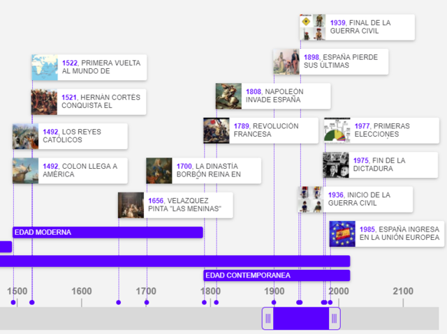 LINEA DEL TIEMPO By sara duran 3000 BCE CULTURA DE LOS MILLARES (ALMERÍA) 1000 BCE LLEGADA DE LOS COLONIZADORES MEDITERRANEOS TARTESSOS, IBEROS, CELTAS Y CELTÍBEROS Period: 1000 BCE to 218 BCE PROTOHISTORIA IBEROS, CELTAS Y CELTÍBEROS 500 BCE LA DAMA DE ELCHE 218 BCE LOS ROMANOS LLEGAN A LA PENÍNSULA Period: 218 BCE to 476 EDAD ANTIGUA DOMINACIÓN ROMANA 90 ACUEDUCTO DE SEGOVIA 476 CAÍDA DEL IMPERIO ROMANO DE OCCIDENTE Period: 476 to 1492 EDAD MEDIA REINO VISIGODO AL-ANDALUS PRIMEROS REINOS 711 LLEGADA DE LOS MUSULMANES 1492 LOS REYES CATÓLICOS CONQUISTAN GRANADA 1492 COLON LLEGA A AMÉRICA Period: 1492 to 1789 EDAD MODERNA DE LOS AUSTRIAS A LOS BORBONES 1521 HERNÁN CORTÉS CONQUISTA EL IMPERIO AZTECA 1522 PRIMERA VUELTA AL MUNDO DE MAGALLANES Y EL CANO 1656 VELAZQUEZ PINTA "LAS MENINAS" 1700 LA DINASTÍA BORBÓN REINA EN ESPAÑA. FELIPE V 1789 REVOLUCIÓN FRANCESA Period: 1789 to 2018 EDAD CONTEMPORANEA 1808 NAPOLEÓN INVADE ESPAÑA 1898 ESPAÑA PIERDE SUS ÚLTIMAS COLONIAS (CUBA, FILIPINAS Y PUERTO RICO) 1936 INICIO DE LA GUERRA CIVIL 1939 FINAL DE LA GUERRA CIVIL 1975 FIN DE LA DICTADURA 1977 PRIMERAS ELECCIONES DEMOCRÁTICAS TRAS LA DICTADURA 1985 ESPAÑA INGRESA EN LA UNIÓN EUROPEA