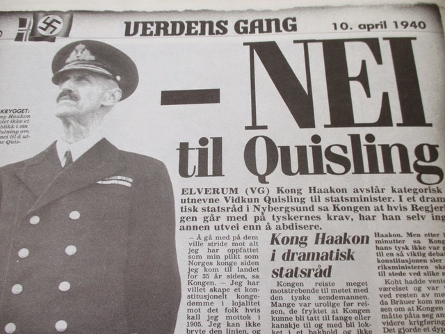 Tyskland angriper Norge, Kongen og regjeringen rømmer mot Hamar og Quisling gjør verdens første statskupp over radioen i samarbeid med Tyskland.