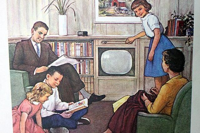 The first coast-to-coast color transmission occurred in 1954; this made the price of black and white TVs so low that most families could afford one, thus changing the focus of family time in households around the world.