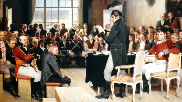 I 1814 kom endelig grunnloven til Norge, da en rekke med embetsmenn og adelsmenn samlet seg på Eidsvoll for å danne Norges nye grunnlov. 112 menn var til stede, og hendelsen ble datert til 17. Mai 1814. 17. Mai er idag vår nasjonaldag på grunn av dette.